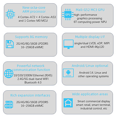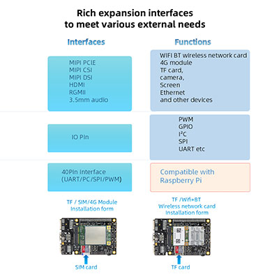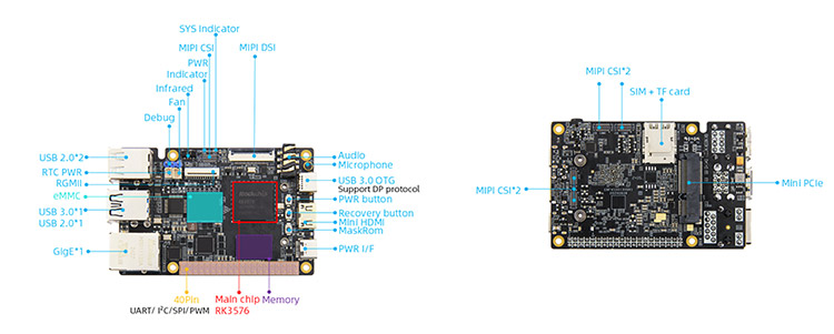 Вграденият Gigabit Ethernet порт, RGMII, USB3.0/2.0, Mini PCLE, Mini HDMI, MIPI екран и MIPI камера и други периферни интерфейси, водещи 40 -пинови неизползвани щифтове, богати интерфейси за разширяване, за да задоволят повече нужди за развитие!