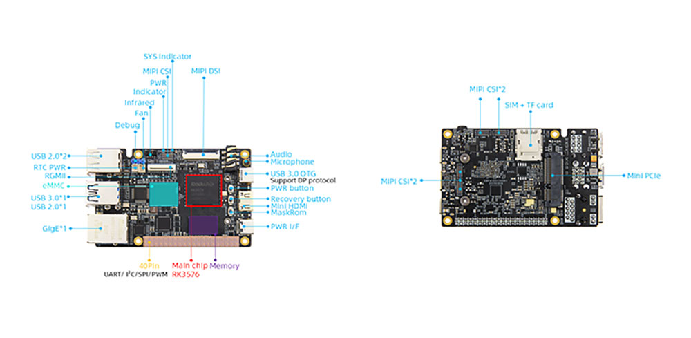 4. Бордови Gigabit Ethernet порт, RGMII, USB3.0/2.0, Mini PCLE, Mini HDMI, MIPI екран и MIPI камера и други периферни интерфейси, водещи 40 -манни неизползвани щифтове, богати интерфейси за разширяване, за да отговорят на повече нужди за развитие!