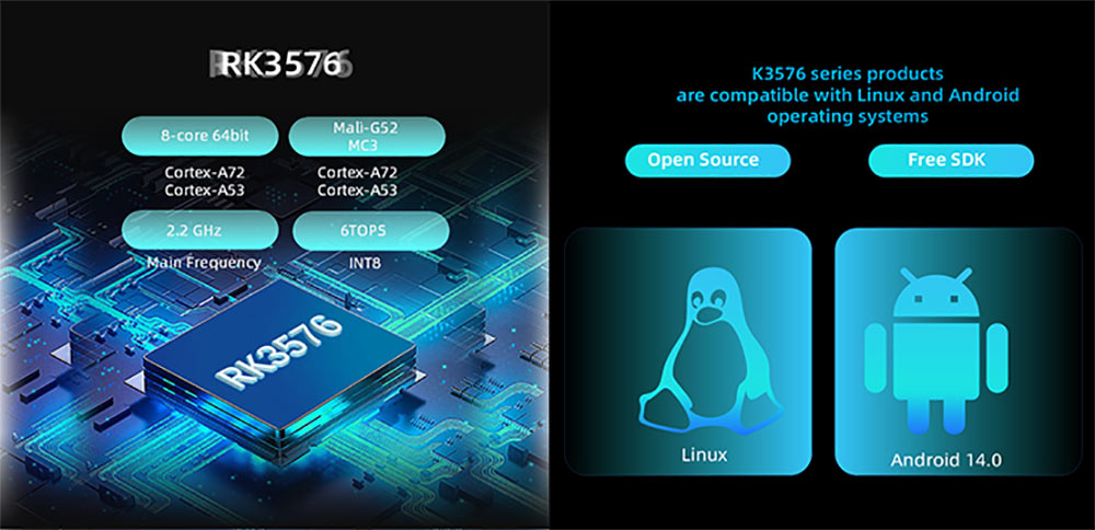 В основата на RK3576 SBC се намира RK3576 чип на Rockchip, проектиран за изчисления с висока ефективност в различни натоварвания. Неговата 8-ядрена хибридна архитектура-включваща 4-кратна ядра на Cortex-A72 и 4x Cortex-A53 ядра-сдвоени с Arm Mali-G52 MP4 GPU, създава двигател за обработка, който се отличава с многозадачни, графични задачи и паралелни изчисления.