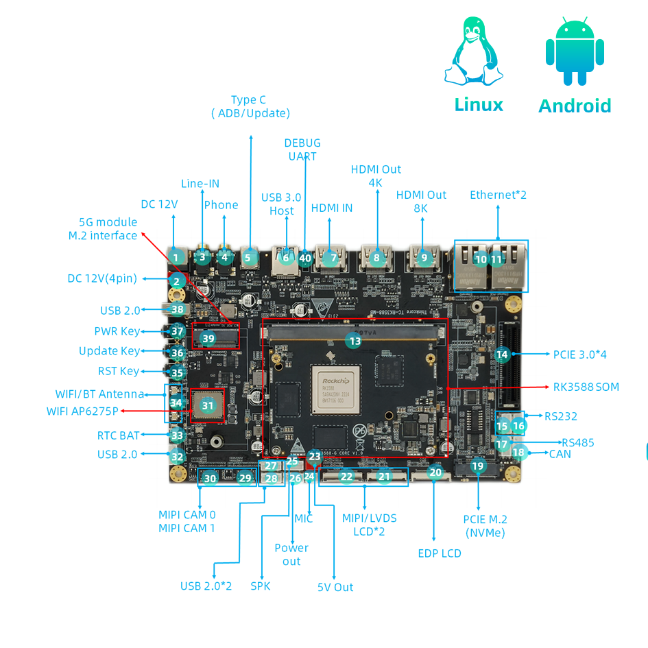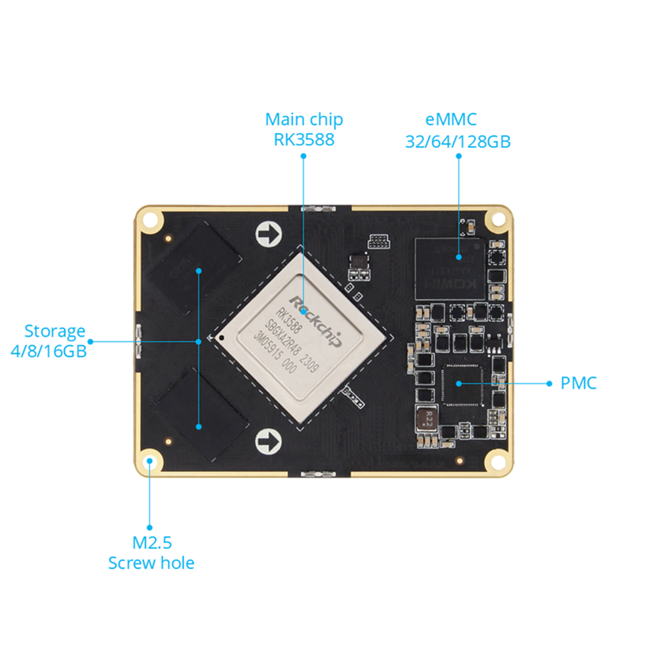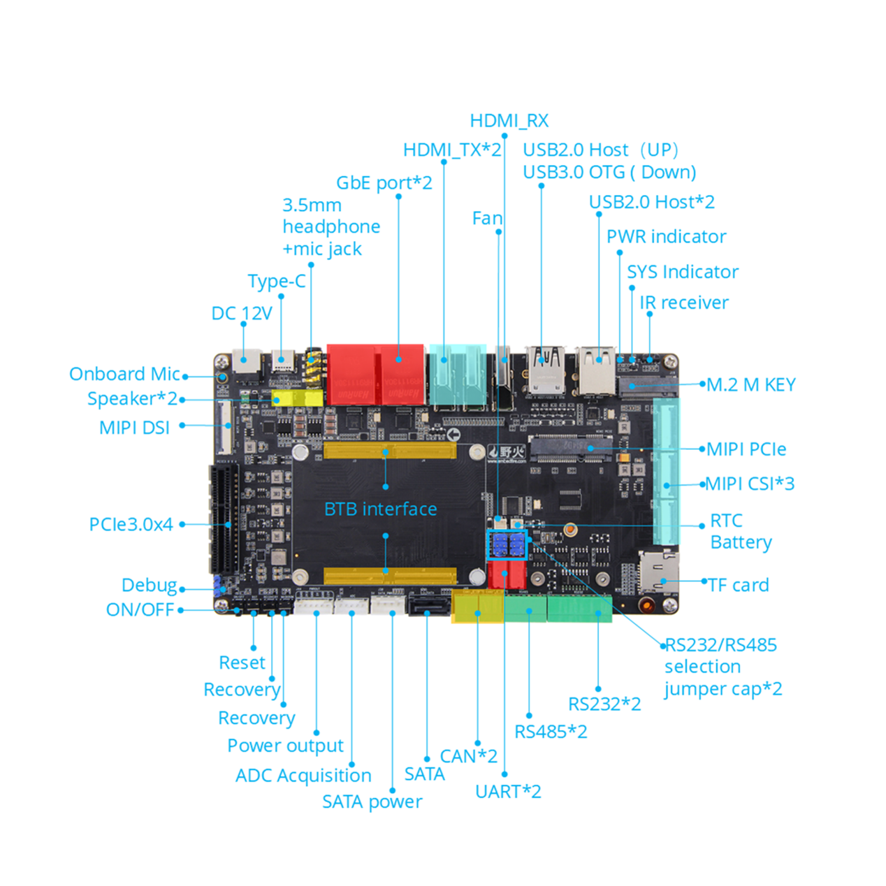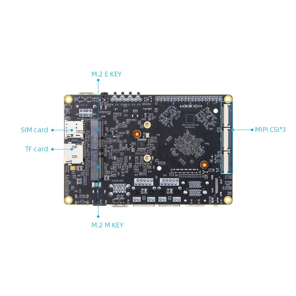 • Основна конфигурация: 16GB LPDDR5 RAM + 128GB eMMC, двоен Gigabit Ethernet порт, два USB 2.0 порта, два USB 2.1 порта, шест MIPI CSI порта, два MIPI DSI порта, Mini-PCle интерфейс (поддържа Wi-Fi мрежови карти, 4G модули, 5G модули или други Mini-PCle интерфейсни модули), 40-пинов разширителен порт (съвместим с 40-пинов порт Raspberry Pi, поддържащ PWM, GPIO, PCI Express, SPI, UART и CAN), M.2 M-KEY, съвместим с M.2 SSD
