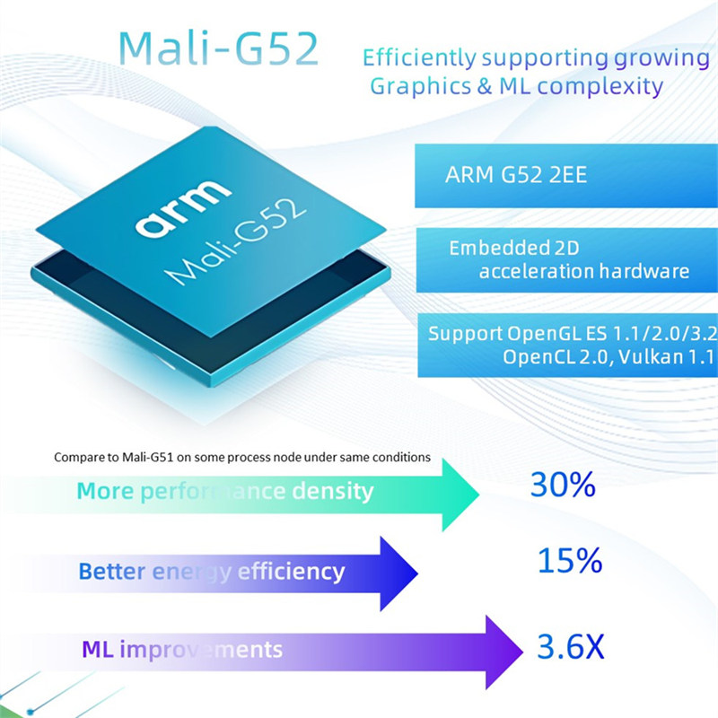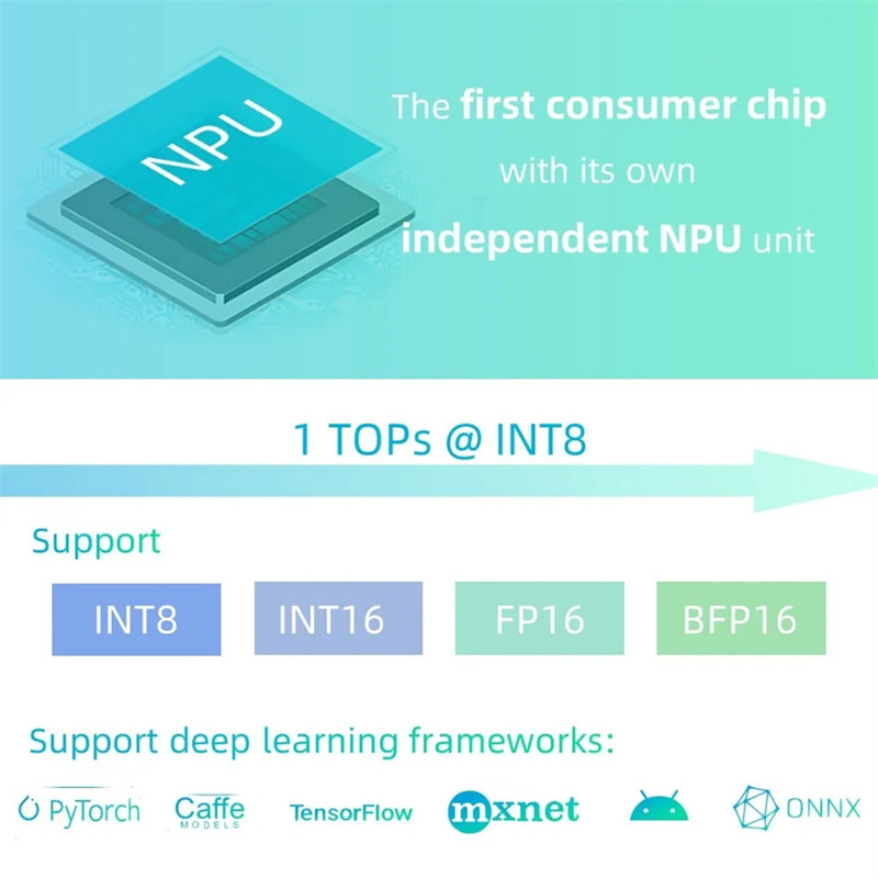 • GPU поддържа OpenGL ES3.2/2.0/1.1, Vulkan1.1; VPU може да реализира 4K 60fps H.265/H.264/VP9 видео декодиране и 1080p 100fps H.265/H.264 Видео кодиране; NPU поддържа Caffe/TensorFlow и други основни смяна на едно щракване на архитектурни модели.