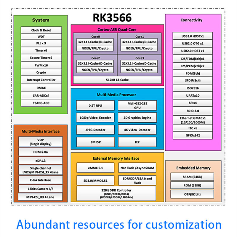 • RK3566 има MIPI-CSIX2, MIPI-DSIX2, HDMI2.0, EDP видео интерфейс, който може да поддържа до три екрана с различен изход на дисплея; Вграден 8M процесор на ISP Image Signal, който може да поддържа двойни камери и HDR функции;